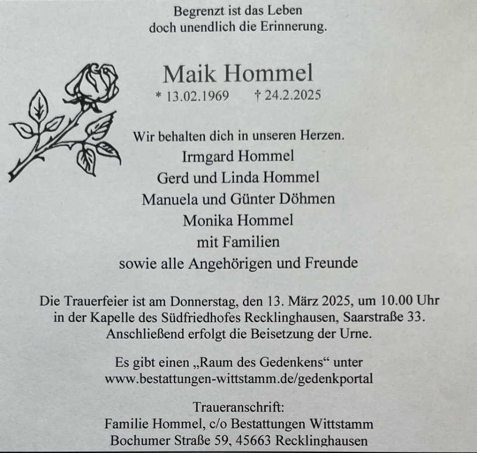 Unsere aufrichtige Anteilnahme besonders an Maiks Mama.